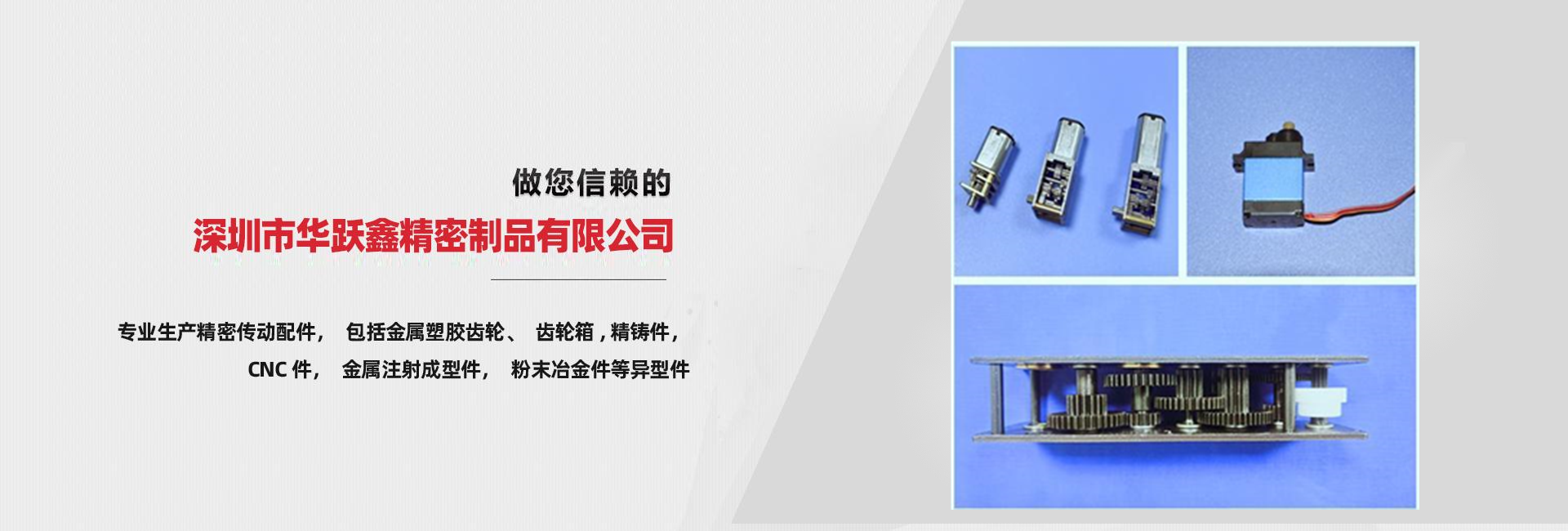 深圳市華躍鑫精密制品有限公司創(chuàng )建于2008年,具備專(zhuān)業(yè)模具設計、產(chǎn)品開(kāi)發(fā)能力,專(zhuān)業(yè)生產(chǎn)以銅、鐵、不銹鋼為原材料的粉末冶金制品,齒輪,蝸輪蝸桿,金屬注射成型異型件;以POM、尼龍、鐵氟龍等為原材料的塑膠制品,包括:塑膠齒輪、蝸桿,精密注塑件等;以及提供專(zhuān)業(yè)設計、加工各類(lèi)微型齒輪減速器。    產(chǎn)品廣泛運用于各類(lèi)機械設備、辦公設備、醫療器械、車(chē)載DVD系列、航空航天、各類(lèi)精密...